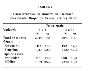 O Município de Duque de Caxias possui um parque industrial bem desenvolvido, tráfego rodoviário intenso e grande densidade populacional. De acordo com o censo de 2.000 do Instituto Brasileiro de Geografia e Estatística (IBGE), o total de pessoas residentes no município era de 770.858, dos quais 142.922 eram crianças e adolescentes, matriculados no ensino fundamental(11). A amostra foi composta por 4.064 alunos de 13 e 14 anos de idade e por 2.765 alunos com idades de 6 e 7 anos, matriculados em 36 escolas públicas e treze privadas, mantendo-se a proporção encontrada na população. As escolas participantes foram selecionadas de forma aleatória, através da geração de números randômicos pelo pacote estatístico do programa Epi-Info 6.