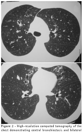 were bilateral and diffuse. Additional examinations showed the following: normal spirometry results, positivity for A. fumigatus in immediate cutaneous reaction allergy testing (skin prick test); eosinophilia (13%) in the blood workup; total serum IgE levels higher than 1000 ng/ml; and radioallergosorbent test (RAST) class 3 in the determination of specific IgE for A. fumigatus. On the chest X-ray, glove-finger shadows were observed in the right superior third (Figure 1). The high-resolution computed tomography scan revealed central bronchiectasis (Figure 2).
