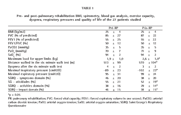 However, despite the improvement in functional parameters seen in the present study, maximum physical capacity was not assessed, thereby precluding the observation of possible physiological alterations, such as increased oxygen consumption, decreased minute volume and improved oxidative capacity of cells. These parameters are widely referred to in the literature(30) and should be studied. In addition, the present study had no control group, a fact which makes the results difficult to interpret.