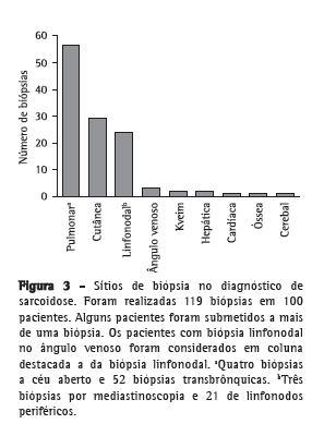 O pulmão foi o principal local de biópsia para definição do diagnóstico (56%), quase sempre através de broncoscopia. As lesões cutâneas foram biopsiadas e confirmaram o diagnóstico em 29 pacientes. A análise histopatológica de linfonodos periféricos foi definidora do diagnóstico em 21 pacientes, além de outros 3 que necessitaram realizar mediastinoscopia e de 3 que foram submetidos à punção de linfonodos no ângulo venoso. Sítios mais raros de biópsia foram o fígado (2%), coração (1%) e osso (1%). Dois pacientes realizaram teste de Kveim-Siltzbach. Alguns pacientes foram submetidos a biópsia em mais de um sítio (Figura 3).