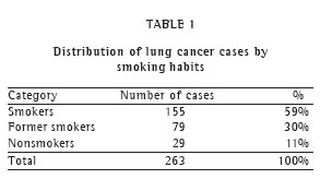 Most of the patients (234 cases = 90%) were smokers or former smokers at the time of diagnosis (Table 1). There was a history of alcoholism in 107 cases (41%). Most of the patients in this study reported no history of pulmonary disease (87%), and among those who did, chronic obstructive pulmonary disease was the most frequent. There were 9 patients (3%) who had a history of extrapulmonary neoplasms. There was a family history of cancer in 73 cases (28%), 16 (6%) of which were cases of pulmonary neoplasm.