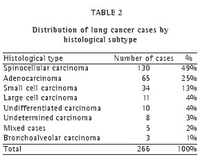 Non-small cell lung cancer (NSCLC) was found in 229 patients (87%), and small cell lung cancer (SCLC) was found in 34 (13%).The most frequent histological type was spinocellular carcinoma, with 49% (Table 2).