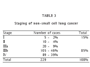 Of the 34 cases of SCLC, 79.4% were extensive. Of the 194 patients with NSCLC (SCC, adenocarcinoma and large cell carcinoma), 84.7% presented extensive staging (IIIb or IV). This corroborates the data in the literature, I according to which, at the time of diagnosis, approximately 50% of patients with lung cancer are at stage IV, 30% in stage III and 10% in both stages I and II.(20)