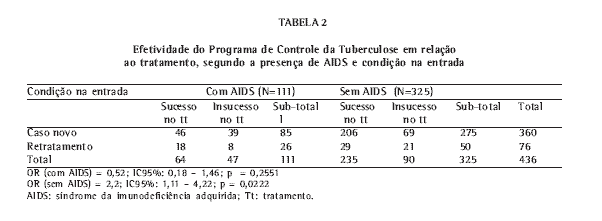 O sucesso entre os casos de TB sem AIDS derivou fundamentalmente da evolução favorável do tratamento dos casos novos. Neste grupo, a chance de resultado favorável foi 2,2 vezes maior que nos que já tinham sido tratados anteriormente.
