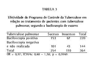 A Tabela 3 apresenta a efetividade do PCT em relação ao tratamento das formas pulmonares. Não há diferença quanto ao sucesso entre os inicialmente BAAR positivos e o restante (OR = 0,97; IC95%: 0,60 - 1,58; p = 0,9969). Quando se categoriza em AIDS e não AIDS também não se constata diferença significativa.