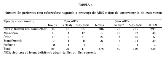 Dentre os 436 pacientes com TB, 111 tinham AIDS concomitante (25,5%) (Tabela 1), 360 eram casos novos (82,6%) e 76 retratamentos (17,4%) (Tabela 2). A AIDS foi diagnosticada em 23,6% dos casos novos (85/360) e em 34,2% dos retratamentos (26/76) (Tabela 2). Houve apresentação pulmonar em 364 casos (83,5%) e extrapulmonar em 73 (16,8%) (Tabela 3).