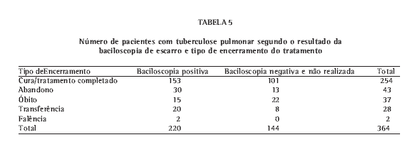 Foram definidos os seguintes desfechos(4), como resultado do tratamento: encerramento por cura ou tratamento completado, quando, durante o tratamento, o paciente apresentava duas baciloscopias negativas, uma na fase de acompanhamento e outra no final do tratamento (foram, também, considerados neste grupo, os pacientes com baciloscopia negativa para bacilo álcool-ácido resistente (BAAR) no início do tratamento e que usaram a medicação pelo tempo previsto - cura não comprovada ou tratamento completado); encerramento por abandono, quando o doente deixava de comparecer à unidade por mais de 30 dias consecutivos, após a data prevista para retorno; encerramento por transferência, quando o doente era transferido para outro serviço de saúde; encerramento por óbito, por ocasião do conhecimento da morte do paciente, durante o tratamento e independentemente da causa; encerramento por falência, quando havia persistência da positividade do escarro ao final do tratamento ou manutenção da positividade até o quarto mês.