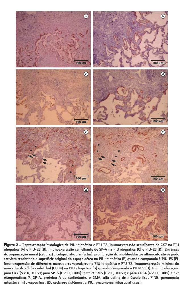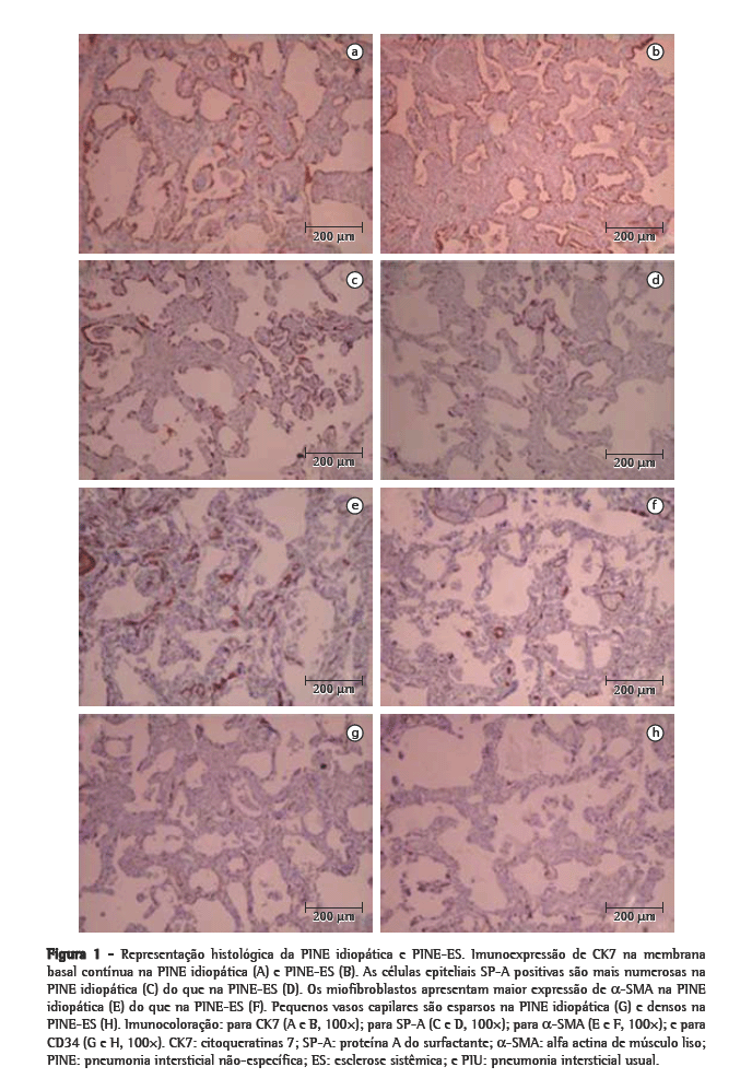 Recentemente, nosso grupo demonstrou associações entre a matriz extracelular e o remodelamento vascular.(27,28) Os resultados sugerem que os componentes da matriz extracelular não só participam do processo de remodelamento, permitindo, assim, mudanças na vascularização, mas também regulam a proliferação endotelial. Também mostramos que o colágeno tipo V aumenta na PIU, e que é o mais importante preditor de sobrevida. Nossa intenção principal no presente estudo foi avaliar o parênquima (células epiteliais CK7 e SP-A positivas) e o interstício septal (células endoteliais CD34 positivas e miofibroblastos α-SMA positivos), bem como os componentes da matriz extracelular (colágeno e fibras elásticas), em casos de PII e de pneumonia intersticial associada à ES. Entretanto, o envolvimento do colágeno tipo V deve ser estudado em um estudo prospectivo que inclua novos casos de pneumonia intersticial associada à ES.