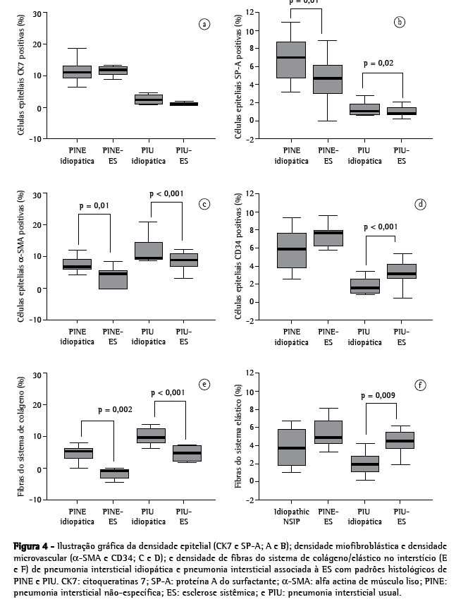 As células epiteliais positivas (CK7 e SP-A), as células endoteliais (CD34) e os miofibroblastos (α-SMA) foram analisados sem análise de imagem, já que o o método usando apenas a ocular é mais específico para quantificar as estruturas e formas que apresentariam densidades semelhantes à análise da imagem. Resumidamente, usamos uma ocular de 400× contendo um retículo com 100 pontos e 50 linhas para a contagem sistemática da fração de linhas recobrindo estruturas positivamente coradas.(17) No padrão histológico da PIU, a heterogeneidade temporal e as áreas alternadas de remodelamento representaram três áreas diferentes na mesma biópsia. Como habitualmente, quantificamos 10 campos por biópsia quando a distribuição das lesões era homogênea, como no padrão histológico da PINE, ao passo que quantificamos 30 campos por biópsia nos casos de PIU: 10 em áreas normais; 10 em áreas intermediárias (colapso alveolar); e 10 em áreas de remodelamento (fibrose mural e áreas de faveolamento). Calculamos a média dos campos microscópicos para obter a porcentagem final de estruturas coradas.