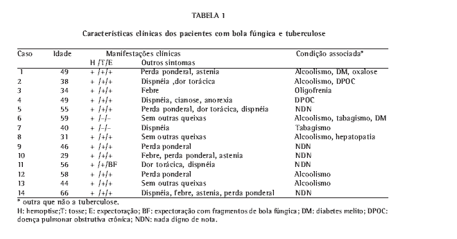 Resultados: Foram selecionados catorze pacientes. Todos apresentaram hemoptise, seguida de tosse com expectoração, dispnéia, emagrecimento, febre, astenia e dor torácica. Em dois casos, um colonizado por Aspergillus niger e outro por Scedosporium apiospermum (Teleomorfo, Pseudallescheria boydii), houve concomitância lesional da tuberculose ativa e bola fúngica. Nos demais, a micobactéria foi encontrada em parênquima circunjacente ou em pulmão contralateral.