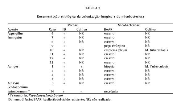 A comprovação etiológica da colonização fúngica foi obtida por soromicologia em 11 pacientes sem condições cirúrgicas (79%), peça cirúrgica (Casos 9 e 10 ), material de biópsia por fibrobroncoscopia (Caso 1), e necropsia (Caso 14). A documentação da micobacteriose em 12 (86%) pacientes foi feita pela microscopia (bacilos álcool-ácido resistentes) e somente em dois (14%) pacientes foi obtido cultivo para M. tuberculosis (Casos 1 e 10).