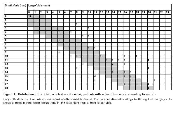 In conclusion, the results of the present study should serve as a warning to researchers evaluating the risk of tuberculous infection in longitudinal studies, as well as for those who intend to make prevalence comparisons in transversal studies. Alterations in the size of indurations, rather than suggesting M. tuberculosis infection, may simply indicate reading and interpretation errors related to the use of tuberculins of different potencies resulting from variations in adsorption between vials of different sizes.