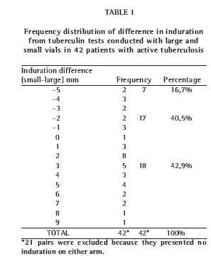 In this study, tuberculin stored in large vials was found to produce larger indurations than that stored in small vials. Figure 1 and Table 1 show that most (72%) of the differences were positive (large-vial indurations larger than small-vial indurations). It is of note that, in this study, the syringes, needles, the application and reading technique, the observer, the patients and the tuberculin were the same in all tests. The only difference was the size of the vials. Biological variations greater than 6 mm have been accepted when serial tests are conducted with the objective of detecting recent TB infection(12). Biological variations may explain part of the difference found between indurations, but no tendency for positive differences would be expected in this case.