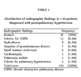 Chest X-rays present enlarged right ventricle, prominent main pulmonary artery, obliteration of the peripheral vasculature and angled superior diversion of the pulmonary vessels(3). In the great majority of the cases, chest X-rays appear normal, as documented in the present study (Table 1).