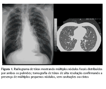 O radiograma de tórax mostrou múltiplos nódulos focais em ambos os pulmões. A tomografia computadorizada de alta resolução confirmou a presença desses pequenos nódulos, sendo o maior de 10 mm de diâmetro. As lesões localizavam-se predominantemente em lobos superiores mas, com menor extensão, distribuíam-se também pelos campos pulmonares médios, poupando as bases e os ângulos costo-frênicos. Cistos e cavitações nesses pequenos nódulos não foram encontrados. Não se detectaram adenomegalias (Figura 1).