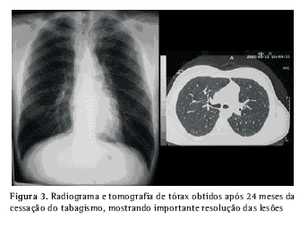 No presente relato, houve nítida relação temporal entre o abandono do fumo e as melhoras clínica e radiológica, confirmadas por avaliações seriadas. Cerca de três meses após o abandono do tabagismo, foi possível registrar a melhora radiológica objetiva, o que nos leva a crer que o presente caso contribui para a hipótese de que a cessação do tabagismo favorece a evolução favorável da doença.