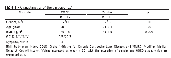 Because the groups were matched for gender and age, there were no significant differences in terms of those variables (p = 1.00). There were significant differences between the two groups in terms of the mean BMI, which was lower in study group than in control group (p < 0.01). The participants with COPD presented with a mean FEV1 of 43.4 ± 19.5% of predicted. Among study group participants, all of the different stages of disease severity were represented, the most common being stage III. These results can be seen in Table 1.