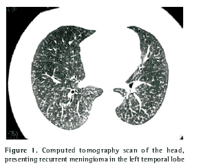 A 67-year-old white female patient (housewife) sought medical attention after experiencing dry cough, wheezing and prostration, together with dyspnea upon maximum exertion, for four months. The patient had been treated with bronchodilators for two weeks with no clinical improvement. No history of smoking or previous pulmonary disease was reported and, six months prior, the patient had been submitted to resection of fibroblastic meningioma of the left temporal region. Tomography revealed an intracranial tumor at the original (temporal lobe) site of the primary lesion (Figure 1), probably related to local recurrence of the lesion.