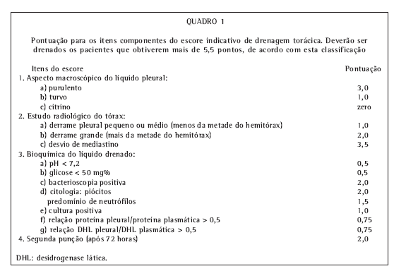 Pelo emprego do referido escore, era obtida uma nota que, ao atingir o valor de corte superior a 5,5, indicaria drenagem pleural fechada. Esse escore foi idealizado entre 1984 e 1990, inicialmente com um ponto de corte de 4,5. Entretanto, ao se observar que alguns pacientes drenados permaneciam de 24 a 48 horas com o dreno, demonstrando rápida melhora (o que levou ao questionamento acerca da real necessidade de drenagem), foi feita uma reavaliação, com novo ponto de corte, elevado para 5,5 (valor utilizado desde 1990). Os componentes do escore empregados no estudo estão listados no Quadro 1.