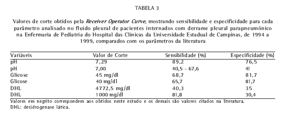 Quanto aos aspectos bioquímicos, estudos mais recentes em adultos(4, 7, 25, 27, 28) e em pediatria(12, 14, 21, 29, 30) indicam drenagem no DPP se pH < 7,0 - 7,2 e/ou glicose < 40 mg%. Neste estudo, houve relação estatisticamente significativa entre necessidade de drenagem e todos estes valores relatados na literatura. Entretanto, à curva ROC, foram apontados como valores com maior sensibilidade e especificidade para indicar drenagem torácica um pH de 7,29 e glicose de 45 mg% (Tabela 3).