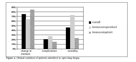 A fragment of lung tissue was obtained from the site presenting the greatest degree of involvement in the computed tomography scan of the chest. In all cases, a pathologist was present at the time of the procedure in order to evaluate the quality of the material obtained. The material was then sent for histopathological study, direct exam and culture (for pyogenic germs, mycobacteria and fungi), immunofluorescence for atypical germs (Legionella sp., Mycoplasma sp. and Chlamydia sp.) and, in suspect cases, for virus culture (using HEp2 cells in Eagle Hanks medium supplemented with bovine fetal serum).