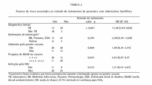 Resultados: Foram incluídos 63 casos. Associação ao vírus da imunodeficiência humana ocorreu em 31,7%. Quarenta pacientes foram admitidos pelo pronto-socorro (63,5%). Suspeita de tuberculose esteve presente na admissão em 42 pacientes (66,7%). O intervalo entre admissão e coleta de escarro excedeu 12 horas em 27,5% dos casos admitidos pelo pronto-socorro e em 30,4% dos internados nas enfermarias (p = 0,803). Retardo no isolamento respiratório ocorreu em 31 casos (49,2%). Os fatores associados ao retardo de isolamento foram ausência de tuberculose no diagnóstico de admissão (p < 0,000) e carga bacilar mais baixa no escarro (p = 0,032). Infecção pelo vírus da imunodeficiência humana (p = 0,530), enfermaria de hospitalização (p = 0,284) e presença de co-morbidades (p = 0,541) não foram associados ao retardo de isolamento. O intervalo entre coleta e início de tratamento foi superior a 24 horas em 15,9% dos casos.