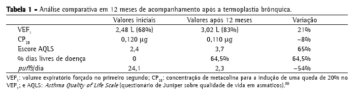 A termoplastia brônquica foi um procedimento seguro e bem tolerado pelo paciente, com significativa melhora clínica e funcional no decorrer dos primeiros 12 meses de seguimento após o tratamento. Este é o primeiro paciente tratado na América Latina e os resultados demonstram tratar-se de uma modalidade terapêutica, embora ainda em fase experimental, promissora no controle e tratamento de sintomas em asmáticos moderados e severos. Novos estudos com um número maior de pacientes são necessários para confirmar a eficiência e utilidade da termoplastia brônquica a longo prazo em asmáticos.