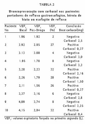 Das 21 provas de broncoprovocação realizadas, 17 foram feitas em mulheres e 4 em homens; 10 foram em pacientes portadores de RGE ou de esofagite de refluxo ou de hérnia de hiato, como mostram as Tabelas 1 e 2. Observamos que destes pacientes, 6 apresentavam RGE, 3 esofagite de refluxo, e 3 apresentavam hérnia hiatal (todos diagnosticados por endoscopia digestiva). Seis pacientes estavam em uso de bloqueador de bom-ba de prótons para tratamento destas doenças. Dois pacientes apresentavam história de rinite tratada e 5 dos 10 pacientes reagiram positivamente ao teste de broncoprovocação (queda de VEF1 > 20%).