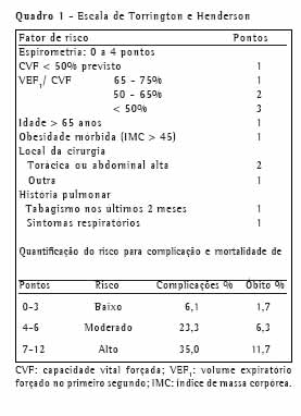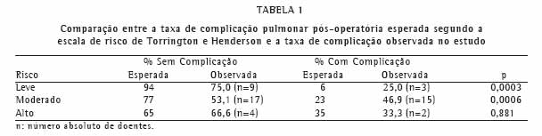 A escala preconizada por Torrington e Henderson(4) foi validada em nosso meio em 2000.(5) A conclusão final foi que a escala era capaz de estimar a probabilidade de ocorrência de complicações pulmonares e mortalidade nas três categorias de risco: alto, moderado e baixo.