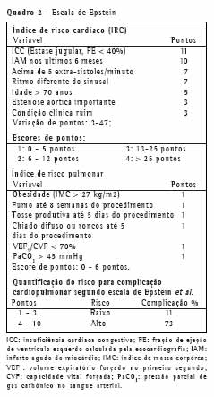 A escala de Epstein, além de contemplar aspectos relacionados ao quadro respiratório, leva em consideração a condição cardiovascular do candi-dato ao procedimento operatório. A princípio, os aspectos respiratórios e cardíacos são avaliados separadamente e cada qual é expresso por uma pontuação. Posteriormente, os valores relativos ao quadro cardíaco são convertidos em uma outra categoria de pontos, que varia de 1 a 4. O soma-tório dos pontos relativos ao quadro pulmonar (variação de 0 a 6) com os do quadro cardíaco configura o risco final, que tem variação de 1 a 10. Doentes com pontuação final igual ou superior a 4 são considerados como de alto risco para CCP (Quadro 2).