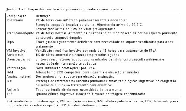 As complicações pulmonares consideradas para efeito de análise foram pneumonia, traqueobronquite, insuficiência respiratória aguda, ventilação mecânica por mais de 48 horas, atelectasia e broncoespasmo. Para fins comparativos, consideramos as complicações cardíacas utilizadas e definidas por Epstein(6) (Quadro 3).