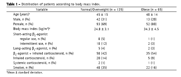 Gender, age, height, smoking habit, body weight, bronchodilator spirometry and prescribed medication were recorded. The BMI was calculated(18) on the basis of weight and height [weight (kg) / height (m)2] and classified according the World Health Organization as normal/overweight (BMI = 29.9 kg/m2) or obese (BMI = 30 kg/m2).