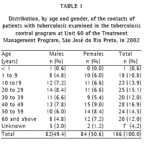 Of the new cases of tuberculosis reported in São José do Rio Preto in 2002, 112 (87%) were reported at Unit 60 of the Treatment Management Program and, for these index-cases, 263 contacts were registered. Only 166 (63.1%) of these 263 contacts were evaluated at Unit 60 of the
