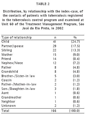 Among the contacts examined in the city of São José do Rio Preto in 2003, 14 cases of tuberculosis were diagnosed, two of which were in contacts of individuals diagnosed with tuberculosis in 2002.(6)
