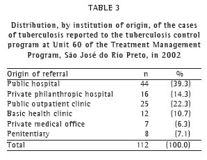 As can be seen in Table 3, the patients with tuberculosis were predominantly - in 69 (61.68%) of the cases - referred from hospitals and public outpatient clinics. In addition, 12 (10.7%) of the cases were referred from basic health clinics, 44 (39.3%) from public hospitals and 16 (14.3%) from private philanthropic hospitals.