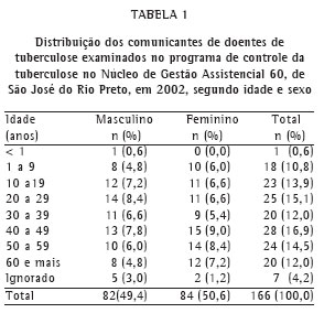 Objective: This study aimed to describe the investigation of tuberculosis contacts enrolled in the Tuberculosis Control Program of the municipality of São José do Rio Preto, Brazil in 2002. Methods: A descriptive study was conducted using secondary data obtained from the Tuberculosis Notification Database, as well as charts and registries compiled by the São José do Rio Preto Tuberculosis Control Program in 2002. Results: A total of 166 household tuberculosis contacts were enrolled in the Program. Of those, 82 were male, and 84 were females. The incidence of tuberculosis was highest (70%) in the 15 to 59 age bracket: 42 (25.3%) of the cases occurred in individuals from 0 to 19 years of age; 73 (44%) in those from 20 to 49; and 44 (25.5%) in those 50 or over. In terms of their relationship with the index patient, 41 (24.7%) were children; 29 (17.5%) were partners; 22 (13.2%) were siblings, and 15 (9.1%) were mothers. The following tests were requested: (in 12%) sputum smear microscopy, culture or both; (in 100%) chest X-ray, revealing 2 suspected cases of pulmonary tuberculosis and 5 cases of other diseases; (in 7.2%) tuberculin skin test, the results of which showed that 4.2% were nonreactors, and that 1.2% presented an induration of 8 mm. Among the contacts examined, the disease was detected in 3 (1.8%). Conclusion: There is no systematization in the monitoring of individuals who are in contact with tuberculosis patients.