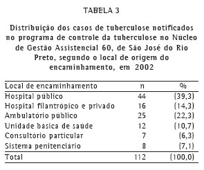 O Município de São José do Rio Preto (SP) é considerado como prioritário no programa de controle da tuberculose (PCT), sendo responsável por quase 50% dos casos notificados na Diretoria Regional de Saúde XXII da Secretaria de Estado da Saúde de São Paulo. No ano de 2002, foram notificados, no município, 135 casos de tuberculose. Destes, 108 eram da forma pulmonar e 27 extrapulmonares, com coeficiente de incidência de 34,69 por 100.000 habitantes. Em 2003, a tuberculose foi o terceiro maior agravo de notificação compulsória no município, com 190 casos.(6)