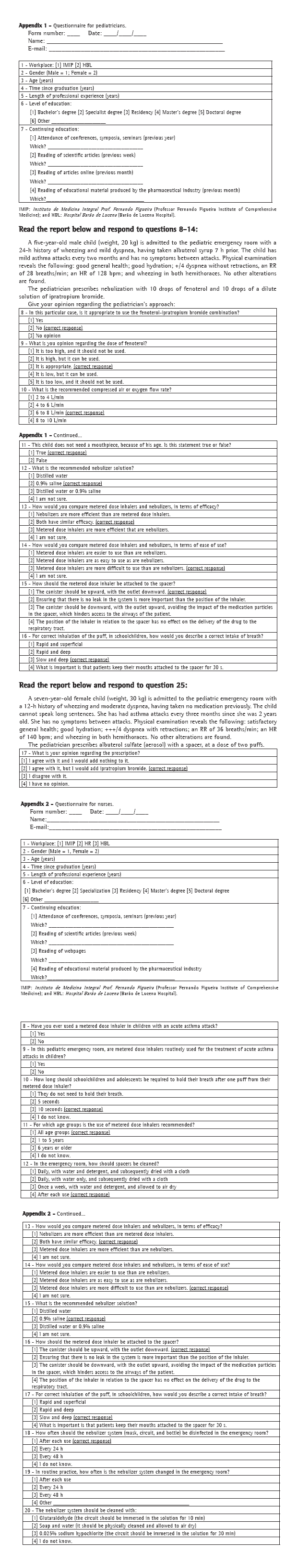 DiscussionAcute asthma is a common problem, and knowledge of acute asthma management is a subject that has rarely been explored in the literature. In light of the current knowledge, the present study raises an important question: Do health professionals in Brazil have sufficient knowledge of acute asthma management in children?