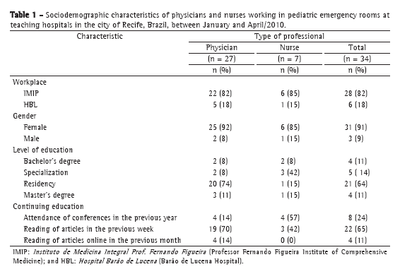 ResultsOf the 45 health professionals at the two hospitals, 10 were excluded because they had less than two years of work experience. One nurse declined to participate in the study, without providing a reason for doing so. Of the remaining 34 health professionals, 27 were physicians and 7 were nurses. The median age of the pediatricians and nurses was 37 years (range, 28-61 years) and 29 years (range, 26-42 years), respectively. The median time since graduation was 13 and 6 years, respectively, and the median length of professional experience was 12 and 6 years, respectively. Table 1 shows other sociodemographic characteristics of the sample.