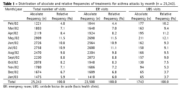 Objective: To evaluate the prevalence of asthma attacks treated in public health facilities in the city of Juiz de Fora, Brazil from February 1, 2002 to January 31, 2003. Methods: This was a cross-sectional study involving monthly analyses performed in order to evaluate the asthma attacks treated. The variables analyzed were patient gender, age, and place of residence, as well as the profile of the visits by age bracket and by the site of the visit. In addition, we attempted to determine whether asthma attacks correlated with temperature or relative humidity. Results: A total of 25,243 patients were treated for asthma attacks, accounting for 11.1% of the total number of visits to pediatric clinics and 2.7% of the total number visits to medical clinics. The mean age of the patients was 11.6 years (median, 4 years), and 52.9% of the patients were male. The analysis of the annual distribution revealed an increase in the number of asthma attacks treated in the months of May (11.5%), June (10.8%), and July (10.9%). Asthma attack presented a strong inverse correlation with temperature (-0.86) and a weak inverse correlation with relative humidity (-0.27). Statistically significant differences, in terms of mean age and gender, were found between patients with asthma attacks treated in emergency rooms and those treated in basic health clinics. The evaluation by age bracket revealed a predominance of males among patients younger than 12 years of age and a predominance of females among those aged 12 or older. Conclusion: We found that asthma represents a significant public health problem in this city. Local strategies are urgently needed in order to increase in the availability of prophylactic treatment.