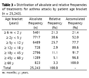 The charts of the patients treated in each month were analyzed, and those treated for asthma attacks were selected. Prior to the study outset, the physicians responsible for the treatment in the different sectors received orientation regarding asthma diagnosis according to the Brazilian Consensus on Asthma Management.(18)