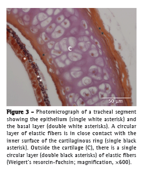 Regarding the relationship between elastic fibers and surgical procedures involving the airways, new findings have emerged from recently attempted experiments involving tracheal replacement in pigs.(11) In the study in question, the authors used aortic allografts to replace a tracheal segment and found that the normal aortic tissue in the allograft was replaced by a morphological structure that resembled a "new trachea", with mature ciliated respiratory epithelium, respiratory glands, islets of cartilage, and even well-formed cartilage arches. Interestingly, this new trachea developed amid islets of elastic fibers in the extracellular matrix of the aortic allograft.(11) The extracellular matrix and the elastic fibers in particular seem to play an important role in the process of tissue regeneration and cellular ingrowth of recipient progenitor cells in the trachea.(10,11) Tracheal replacement might be an option in the future, when radical surgery for primary tracheal tumors, with resection of more than half of the tracheal length, is necessary. In one study on tissue-engineered replacement of a major airway, the authors discussed the active role of the extracellular matrix in regulating various aspects of cell biology that are essential to normal tissue function.(10) Therefore, research on the extracellular matrix of the airway is needed in order to improve the understanding of the morphological changes in this matrix during the process of inflammation and healing. In addition, experiments in the field of bioengineering have emphasized the role of elastic fibers in the development of new extracellular matrix-derived prosthetic materials, such as bioreactive substrates.(10,20)
