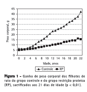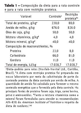 Após o nascimento da ninhada, uma das ratas, a rata controle, passou a receber água e dieta-padrão de laboratório ad libitum e a outra, a rata com restrição proteica (RP), passou a receber água ad libitum e dieta isoenergética com RP durante o período de lactação. A quantidade de dieta que a rata com RP recebeu a cada dia foi calculada com base no consumo médio da rata controle, a fim de evitar que a rata com RP "compensasse" o consumo reduzido de proteína com a ingestão de uma quantidade maior da dieta.(5)