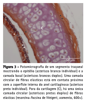Após a perfusão, as traqueias foram dissecadas das estruturas adjacentes, ressecadas, fixadas em solução de formalina a 4% em 0,1 mol/L de PBS (pH 7,4) durante 24 h a temperatura ambiente, processadas de acordo com métodos histológicos de rotina e incluídas em parafina. A partir das amostras incluídas em parafina, seções de 5 µm de espessura foram inicialmente coradas com H&E a fim de confirmar a adequação da amostra. A resorcina-fucsina de Weigert, precedida de oxidação com peroxissulfato de potássio (Oxone®), foi usada para a demonstração e avaliação das fibras elásticas, que se tornaram violeta, produzindo contraste acentuado.