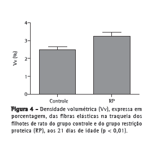 As Figuras 2 e 3 ilustram a avaliação qualitativa das fibras elásticas em ambos os grupos de filhotes, que foram idênticos. No que tange à avaliação quantitativa por meio de estereologia, constatamos que a densidade volumétrica das fibras elásticas foi significativamente maior no grupo RP que no grupo controle (Figura 4). Estudos prévios demonstraram um aumento da concentração de fibras elásticas e elastina durante o processo de envelhecimento. Embora sejam necessárias mais investigações a fim de estabelecer uma correlação direta entre o envelhecimento normal e a desnutrição como influência sobre o processo de remodelação tecidual ao longo da vida, os efeitos da desnutrição sobre ratos Wistar durante os períodos iniciais de vida podem se assemelhar aos efeitos do processo de envelhecimento. Além disso, avanços recentes na área de substituição da traqueia por aloenxertos, substituição de vias aéreas por tecido artificial e o desenvolvimento de novos materiais prostéticos derivados da matriz extracelular exigem maior compreensão da morfologia das fibras elásticas da traqueia e das alterações que possam ocorrer em pacientes submetidos a procedimentos invasivos nas vias aéreas.(10,11,20)