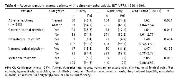 Objective: To describe the clinical and therapeutic aspects of pulmonary tuberculosis and compare the adverse effects of the treatment and its outcome in elderly and nonelderly patients. Methods: This was a case-control study of 117 elderly individuals (over the age of 60 years) and 464 nonelderly individuals (aged 15-49 years). All subjects presented pulmonary tuberculosis that had been diagnosed and treated at the Thoracic Diseases Institute of the Federal University of Rio de Janeiro between 1980 and 1996. Results: In the elderly group, pulmonary tuberculosis was found to be correlated with diabetes (OR = 3.98; 95% CI = 2.07-7.65; p = 0.001), lung disease (OR = 7.24; 95% CI = 3.64‑14.46; p = 0.001) and heart disease (OR = 5.86; 95% CI = 2.88-11.95; p = 0.001). Smoking (OR = 2.07; 95% CI = 1.26‑3.42; p = 0.002) and alcohol abuse (OR = 1.63; 95% CI = 1.01-2.68; p = 0.041) were also more common in the elderly group. In the elderly group, the treatment more frequently resulted in adverse reactions (OR = 1.62; 95% CI = 1.04-2.54; p = 0.024), especially gastrointestinal reactions (OR = 1.64; 95% CI = 1.01-2.77; p = 0.047), and treatment efficacy was lower: cure rate, 51%; mortality rate, 24%. Treatment adherence was low (approximately 77%) in both groups. Conclusions: In the elderly group, adverse reactions were more common, treatment outcomes were less favorable, there was a greater frequency of clinical complications and deaths related to drug toxicity, and the prevalence of concomitant diseases was higher.