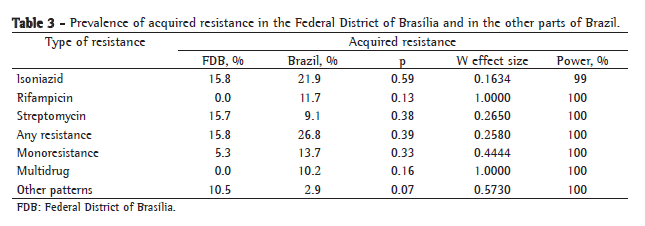 As observed in Tables 2 and 3, there was no statistically significant difference between the prevalences, regardless of the patterns, between primary and acquired resistance in the Federal District of Brasília and in the other parts of Brazil. In two analyzed situations, the "any resistance" or "monoresistance" patterns for the primary type, the prevalences showed virtually identical, translating into a minimal size difference and implying a reduced power. In the Federal District of Brasília, no resistance to EMB was observed, nor was there resistance to PZA and ETH, in accordance with reports for the other parts of Brazil.