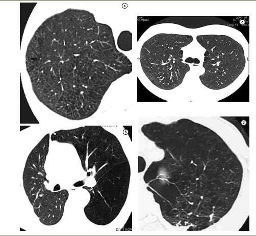 The high-resolution CT (HRCT) can differentiate among the various types of emphysema, in patients with mild or moderate disease,(47) depicting with great similarity the findings of pathological anatomy described above, according to which centrilobular emphysema presents: preference for upper thirds,(45) and it can be confined to these regions; low density multifocal areas resulting from the destruction of the alveoli, predominantly in the medullar portion, distant from the pleura(45); lesions that can be similar to small cystic air spaces, typically without an obvious wall; and lung surrounding lesions, which can be totally normal. With the progression of the disease, centrilobular emphysematous lesions become confluent.