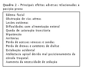 Outro ponto desfavorável é que, em posição prona, a necessidade de sedação é maior, e este fato é preocupante, pois pode aumentar a ocor-rência de paresias neuromusculares, que aparecem freqüentemente em pacientes graves internados nas unidades de terapia intensiva (Quadro 2).