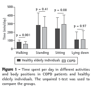 The present study showed that COPD patients in Brazil are less active in physical activities of daily living when compared with healthy elderly individuals. They spent most of their time lying down or seated, in addition to walking with lower movement intensity. These results can be attributed to the sedentary lifestyle adopted by COPD patients as a consequence of the systemic alterations of the disease, although the opposite hypothesis has also been raised, that is, the inactivity can be precursor of the systemic alterations and not its consequence.(28)